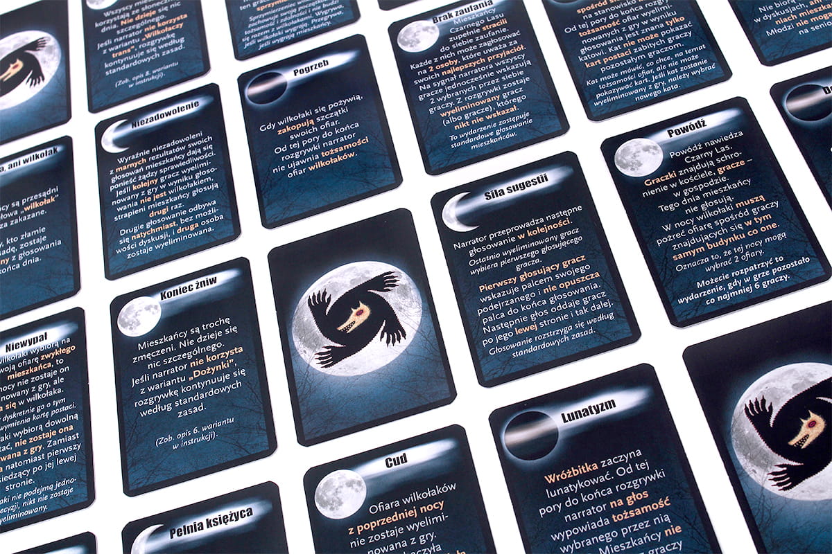 Księżyc w nowiu to rozszerzenie do gry Wilkołaki z Czarnego Lasu, które zawiera wiele ciekawych, alternatywnych wariantów zabawy. Część z nich podwyższa poziom trudności gry poprzez wprowadzenie dodatkowych zasad, inne wskazują, jak bawić się w większym gronie, jeśli posiadamy więcej niż jeden egzemplarz gry. Zestaw zawiera również 5 zupełnie nowych postaci, które dodatkowo urozmaicą nasze rozgrywki.