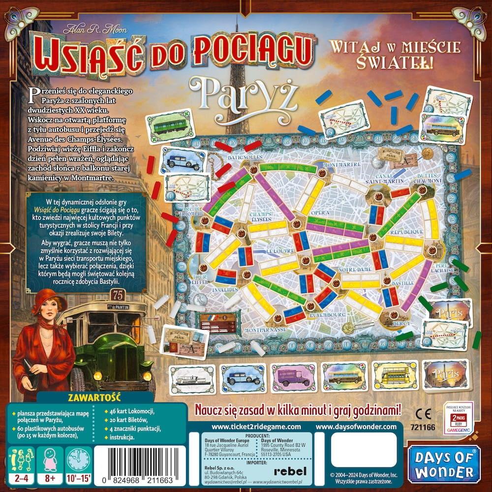 Wsiąść do Pociągu: Paryż to dynamiczna odsłona popularnej serii gier rodzinnych, w której gracze ścigają się o to, kto zwiedzi najwięcej kultowych punktów turystycznych w stolicy Francji i przy okazji zrealizuje swoje bilety. Aby wygrać, musimy nie tylko zmyślnie korzystać z rozwijającej się w Paryżu sieci transportu miejskiego, lecz także wybierać połączenia, dzięki którym będziemy mogli świętować kolejną rocznicę zdobycia Bastylii.