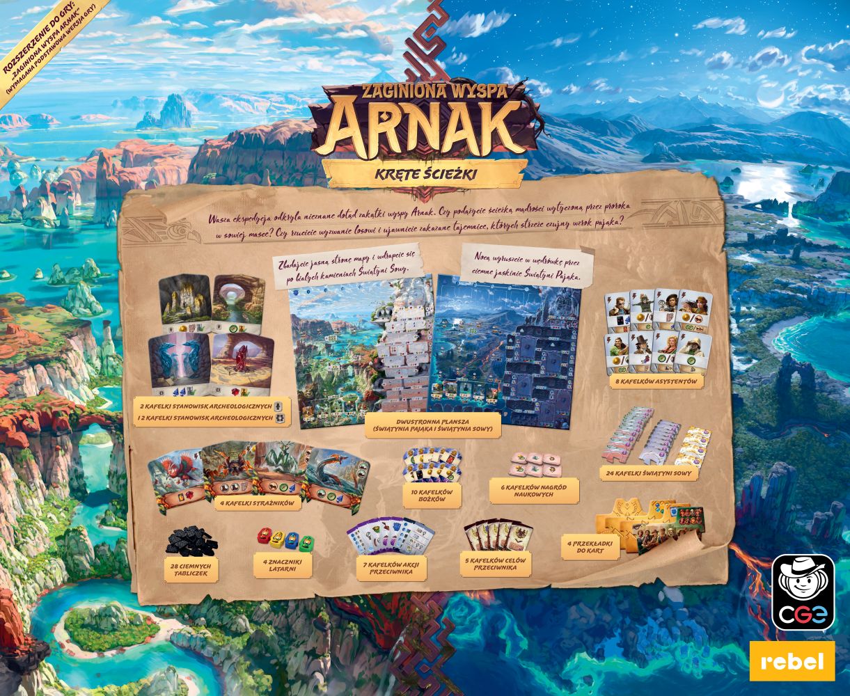 Zaginiona wyspa Arnak: Kręte ścieżki to rozszerzenie pozwalające odkryć nieznane dotąd zakątki wyspy. Czy podążycie ścieżką mądrości wytyczoną przez proroka w sowiej masce? A może rzucicie wyzwanie losowi i ujawnicie zakazane tajemnice, których strzeże czujny wzrok pająka? Wybór należy do Was, a każda droga będzie zupełnie nowym wyzwaniem!