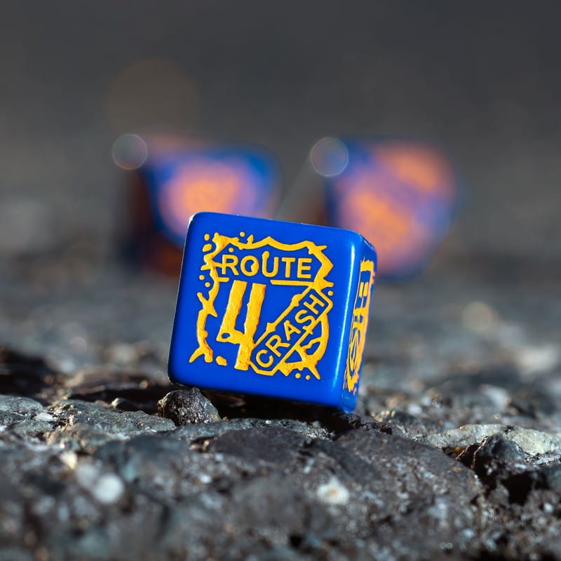 Zestaw Kości Ostateczny Wyścig: Gorączka Szosy utrzymany jest w barwach, które odpowiadają jego nazwie. Niebieskawy asfalt pod kołami i pomarańczowe błyski ostrzegawczych świateł – to widzisz podczas wyścigu! Na kostkach zobaczysz klimatyczne symbole i znaki, które przeniosą Cię w ten post-apokaliptyczny świat. Odpicuj brykę, zwiększ obroty i ruszaj, ścigasz się o wszystko!
