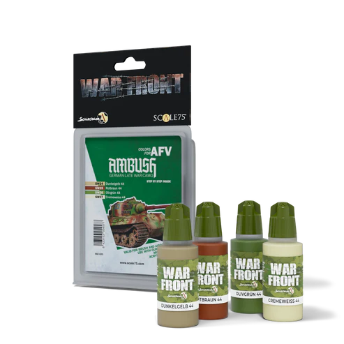 Zestaw 4 matowych farb akrylowych w podstawowych kolorach używanych do malowania niemieckich pojazdów wojskowych podczas bitwy o Ardeny i pod koniec wojny w 1945 roku. Farby te są bardzo trwałe i odporne na wszelkie techniki starzenia, takie jak malowanie olejem, pigmentami i emaliami. Przed użyciem należy przekłuć nakrętkę butelki z farbą. Zalecamy włożenie do butelki małej kulki lub mieszadła, aby ułatwić mieszanie farby. Użycie odpowiedniego rozcieńczalnika akrylowego pozwoli na idealne malowanie aerografem. Dla uzyskania optymalnej wydajności farby zaleca się stosowanie dysz o średnicy 0,4 cala lub większej.