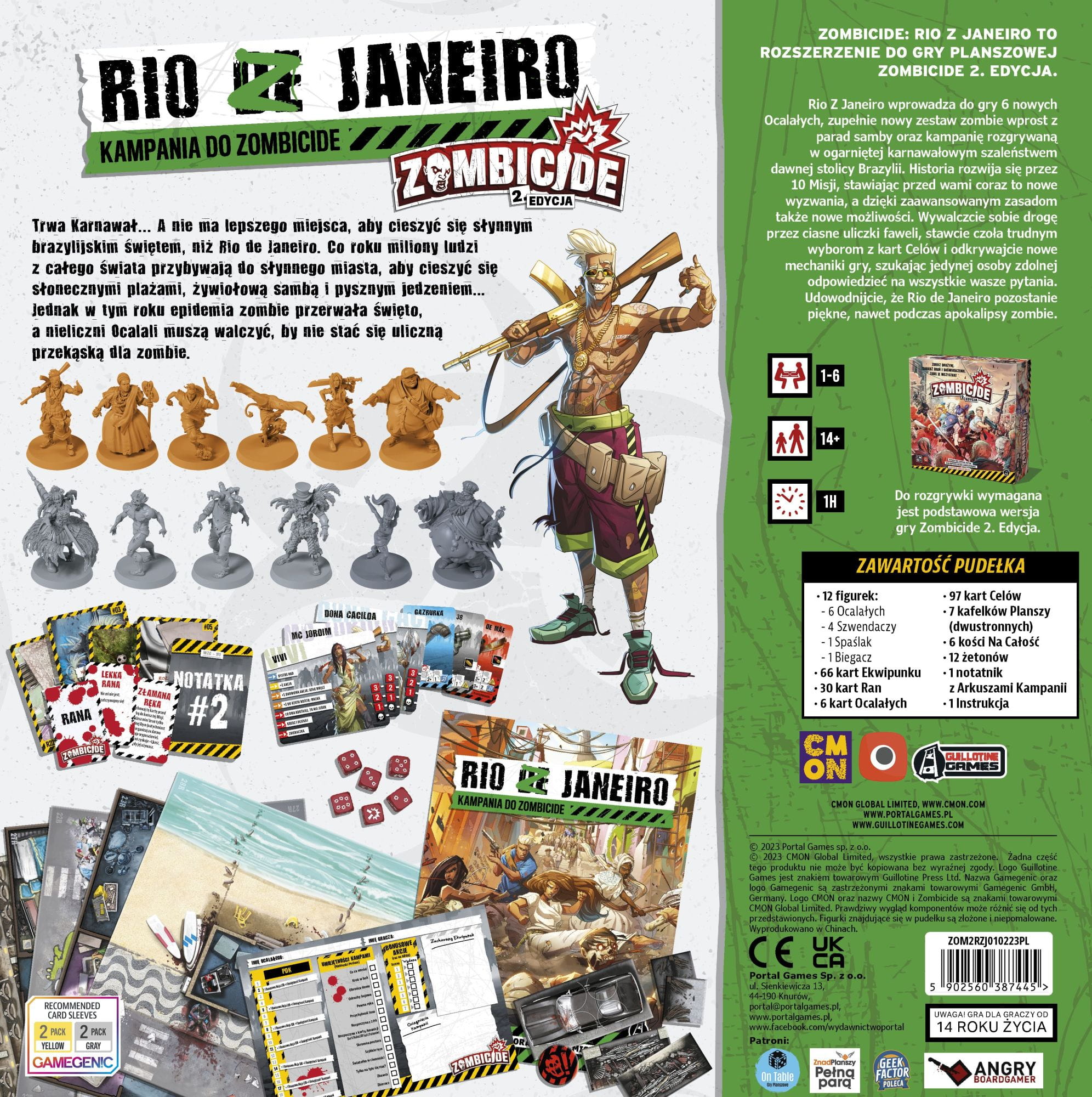 Zombicide 2. edycja: Rio Z Janeiro to dodatek, w którym tropikalny raj zmienia się w karnawał koszmarów. Zombicide 2. edycja: Rio Z Janeiro wprowadza do gry 6 nowych Ocalałych, zupełnie nowy zestaw zombie wprost z parad samby oraz kampanię rozgrywaną w ogarniętej karnawałowym szaleństwem Brazylii. Wywalczcie sobie drogę przez ciasne uliczki faweli, stawcie czoła trudnym wyborom z kart Celów i odkrywajcie nowe mechaniki gry, szukając jedynej osoby zdolnej odpowiedzieć na wszystkie wasze pytania.